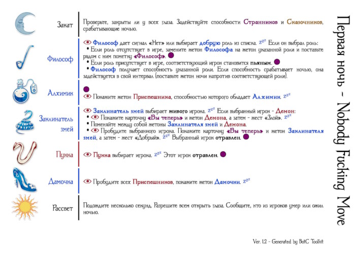 Философ Один раз за игру, ночью: выберите добрую роль. Вы получаете способность этой роли. Если она присутствует в игре, игрок с ней становится пьяным.