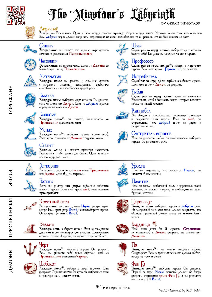 | Савант | Каждый день: вы можете приватно навестить Рассказчика, чтобы узнать два факта. Один из них – правда, а другой – ложь. | |